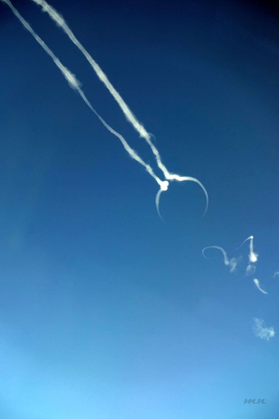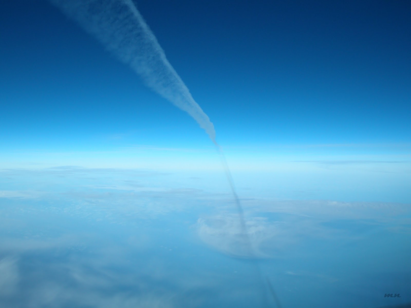 What do you get when you put a cold atmosphere, jet engines and a heavy Boeing 747-8 together? This! A violently twisting and turning contrail. As the water vapor produced in the engines combustion chambers meets the cold atmosphere, it instantly condenses into water droplets (if its cold enough, the vapor will change directly into ice crystals in a process called deposition) thereby creating a contrail (condensation trail). As the contrail meets the powerful but invisible wingtip vortices of a Lufthansa Boeing 747-8, it makes them visible and the result is amazing. From Porto to Paris Orly in Airbus A319 CS-TTH looking out for wake turbulence.