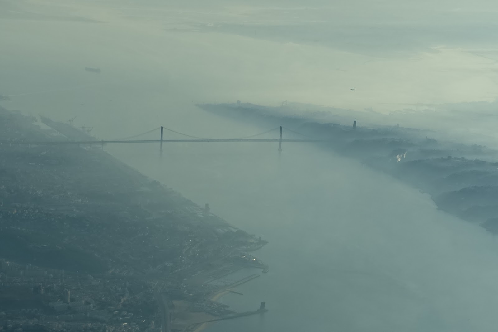 The beautiful suspension bridge that joins the north and south banks of the Tejo river in Lisbon seen from the left downwind leg of a visual approach for runway 03 in Airbus A320 CS-TNP.